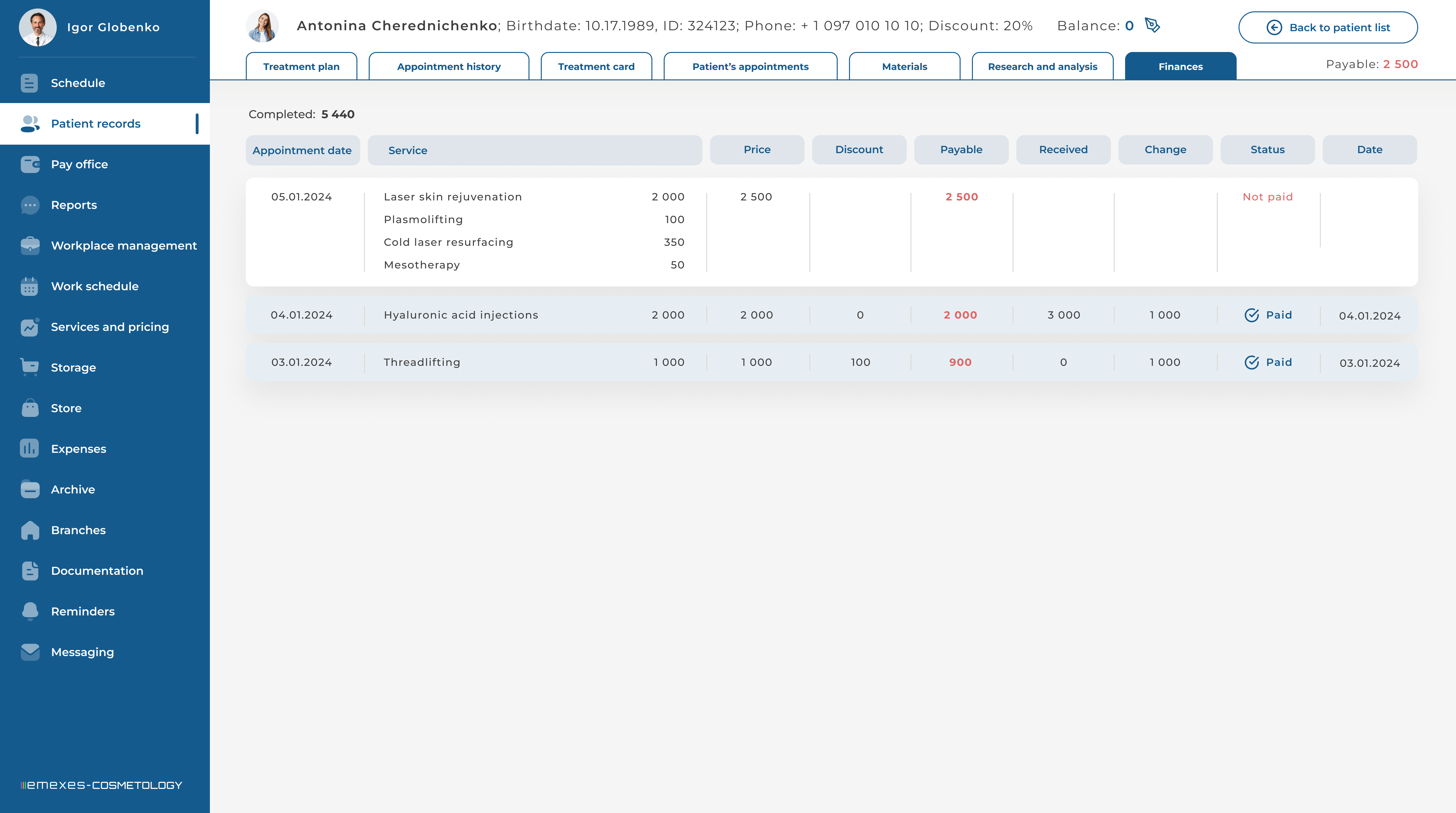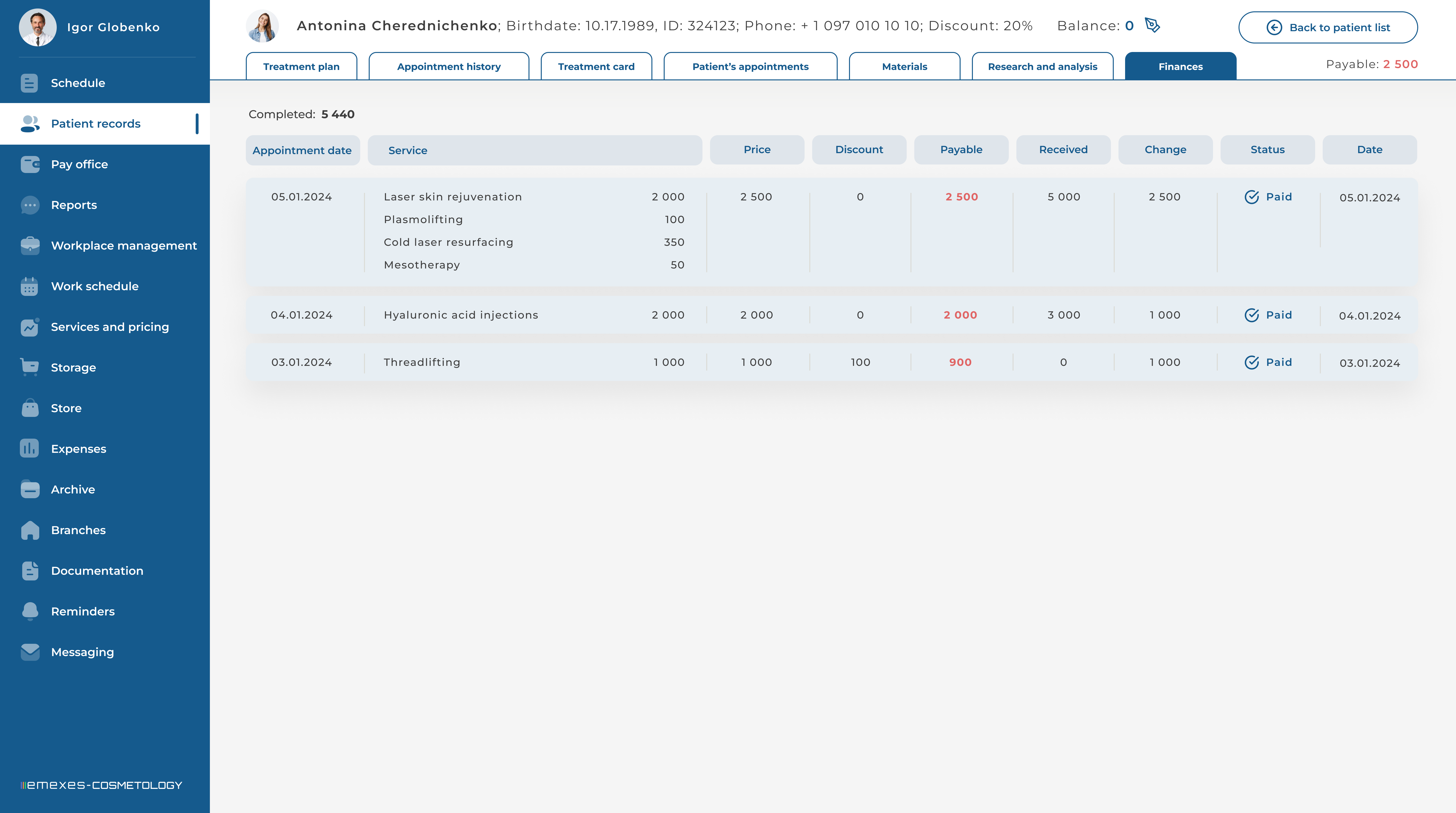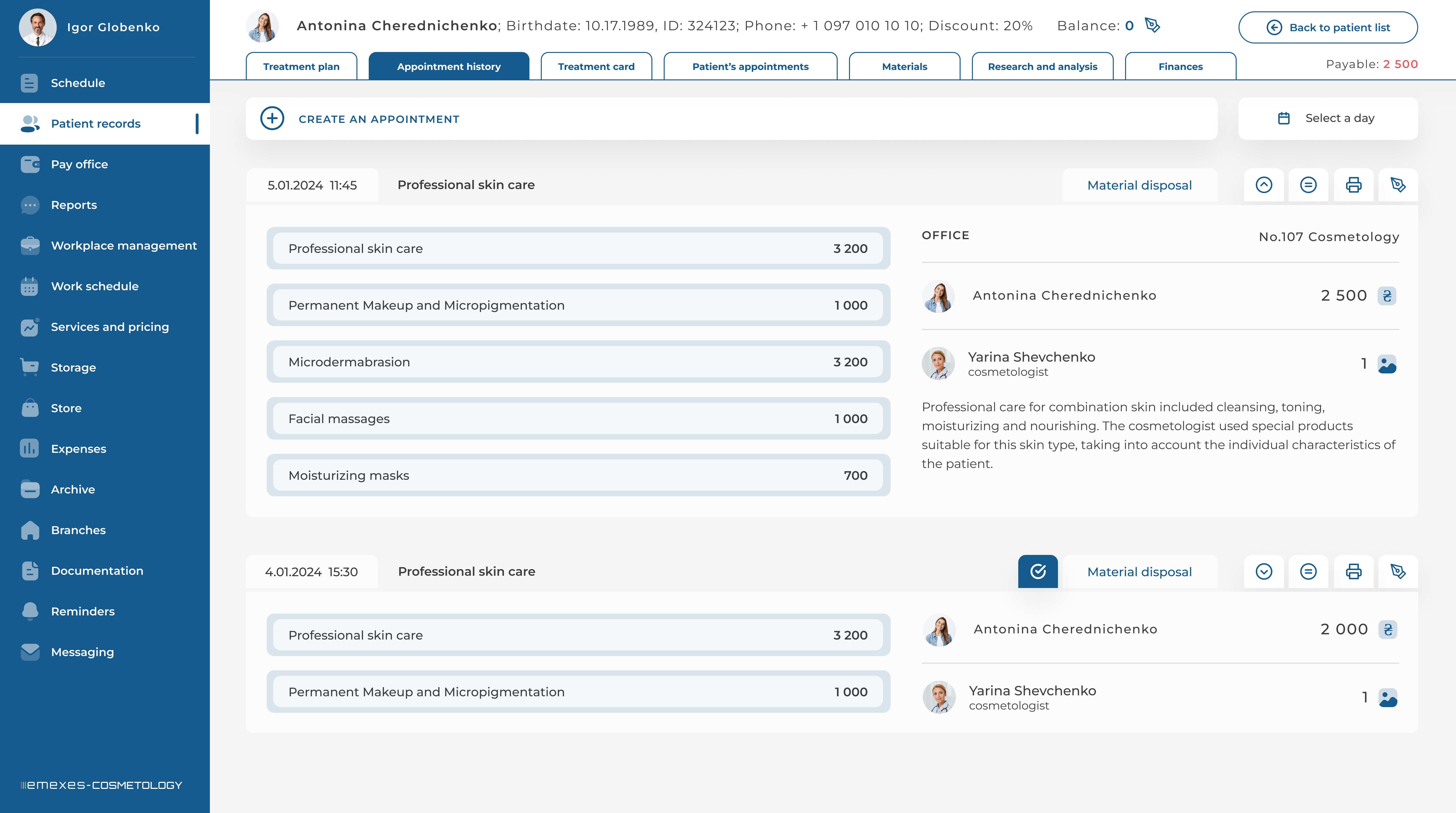 - Automation of all clinic processes: schedule, patient cards, write-off of materials and much more