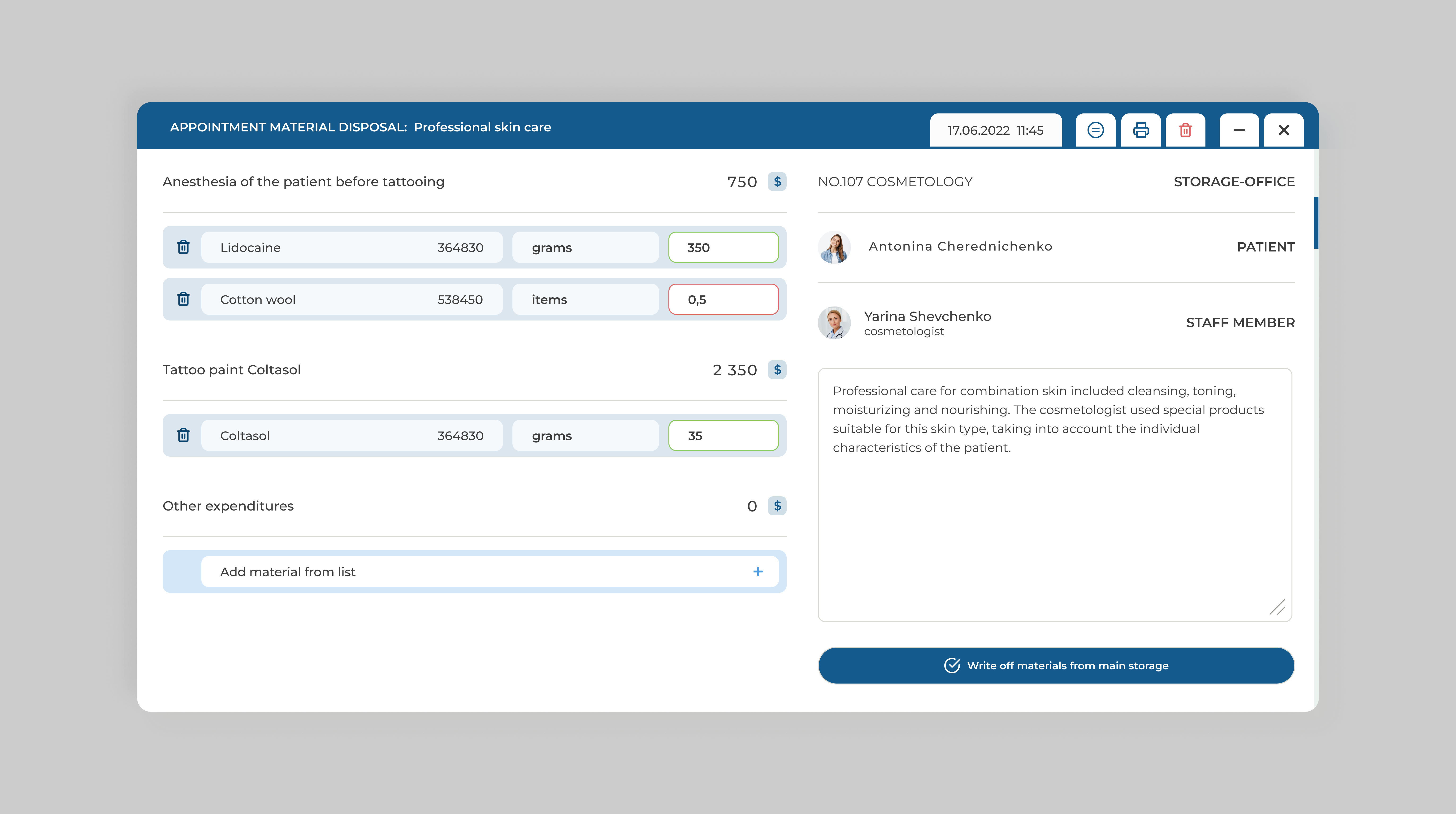 - Auto write-off of materials
