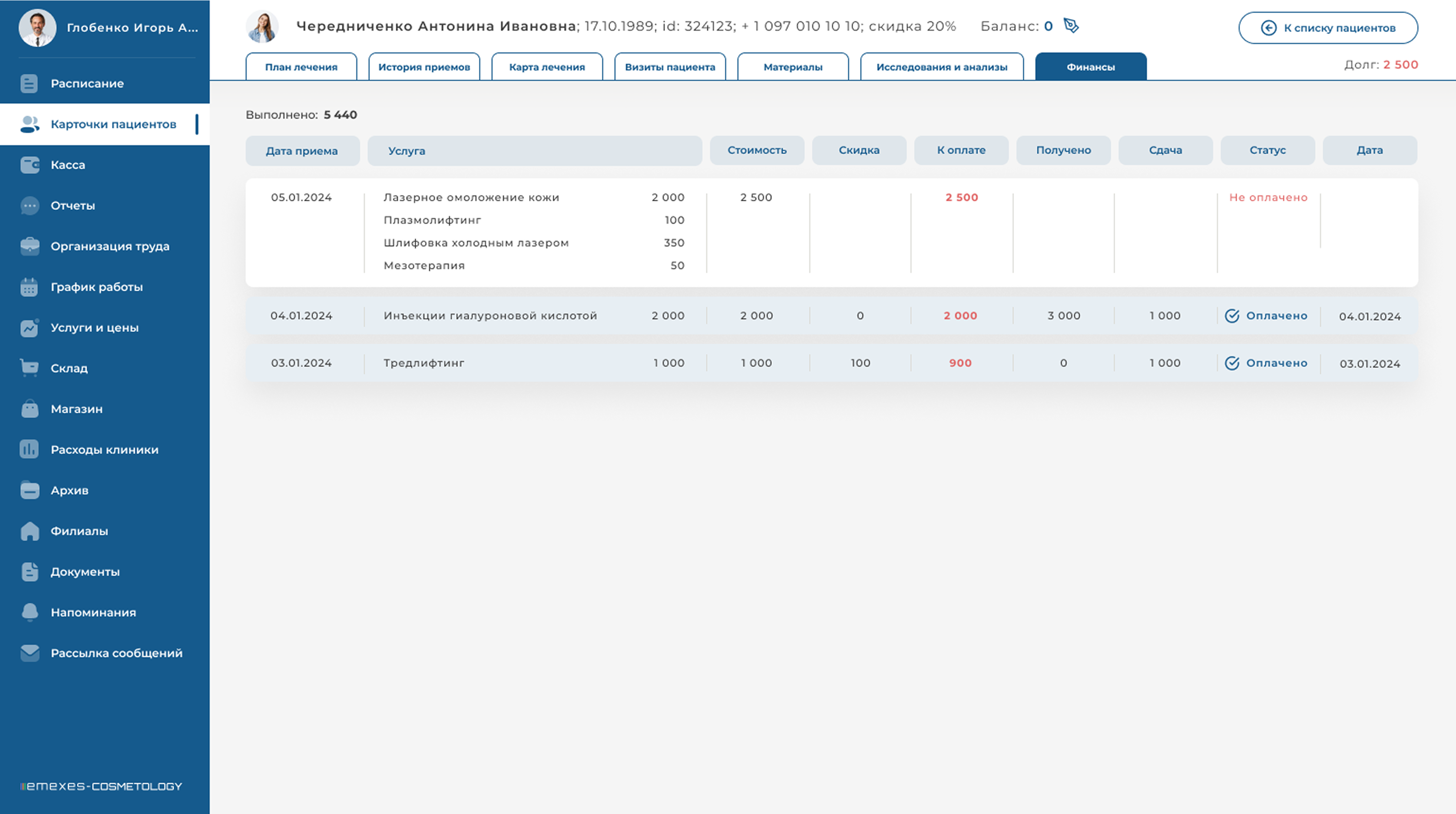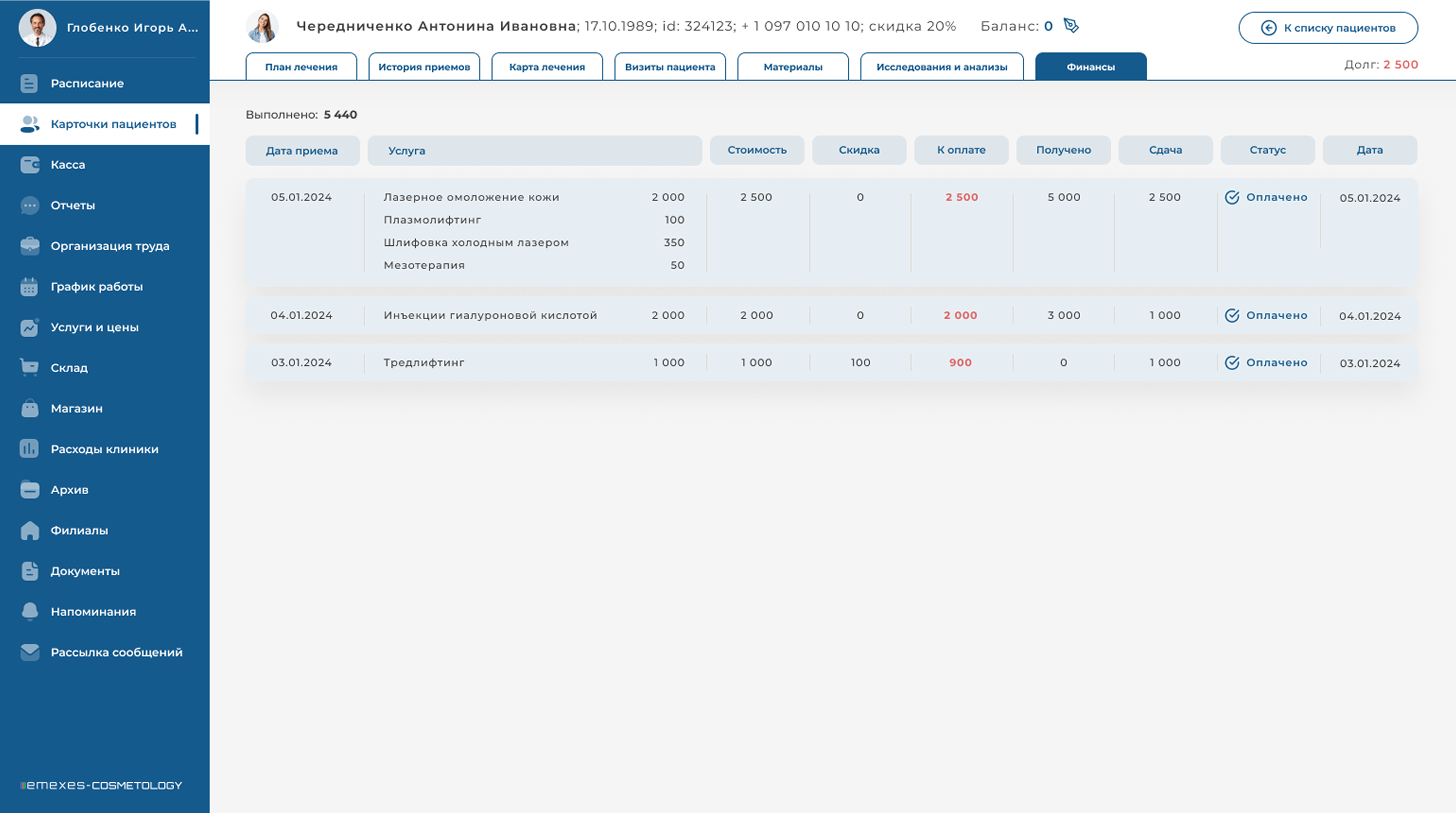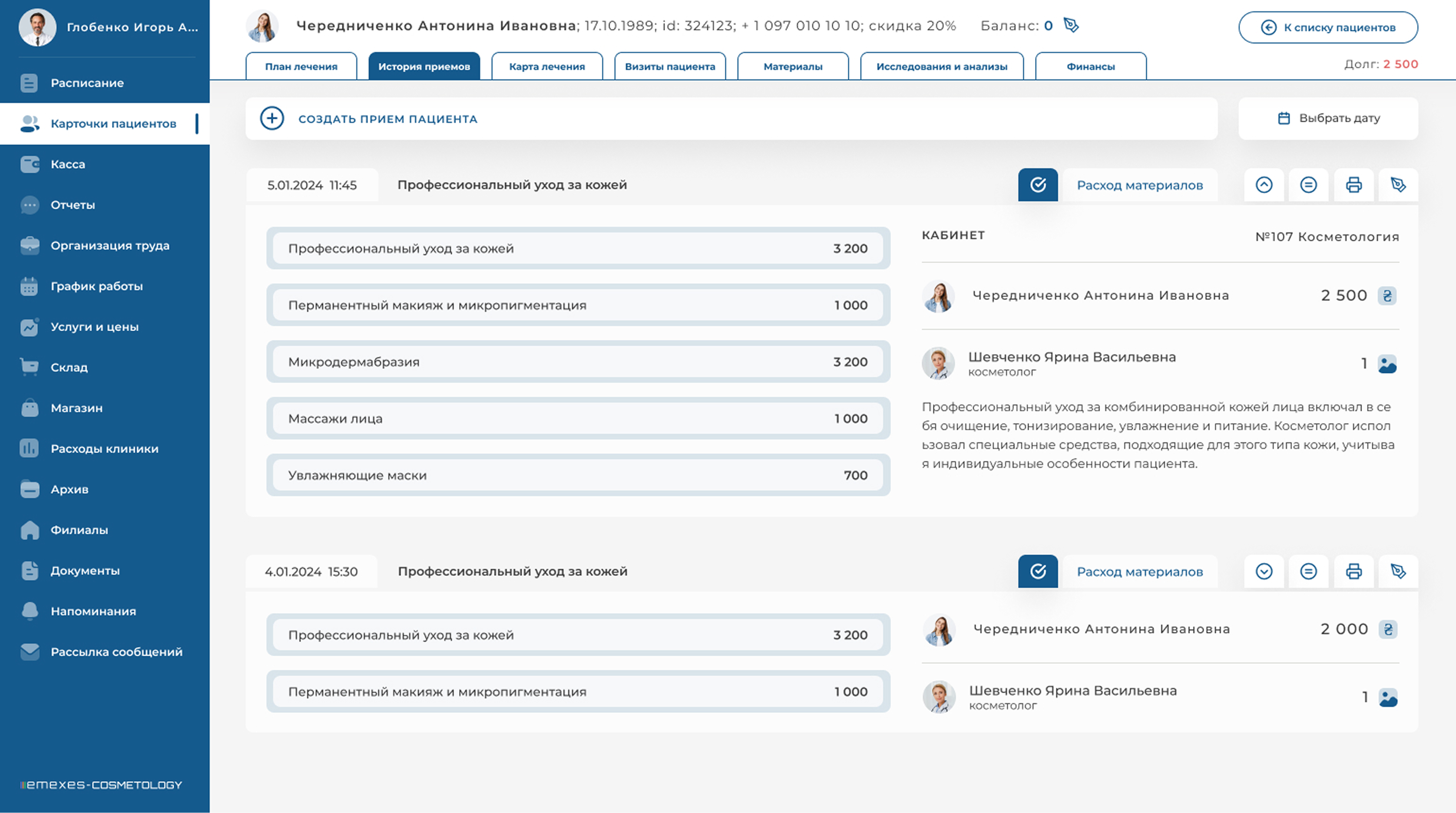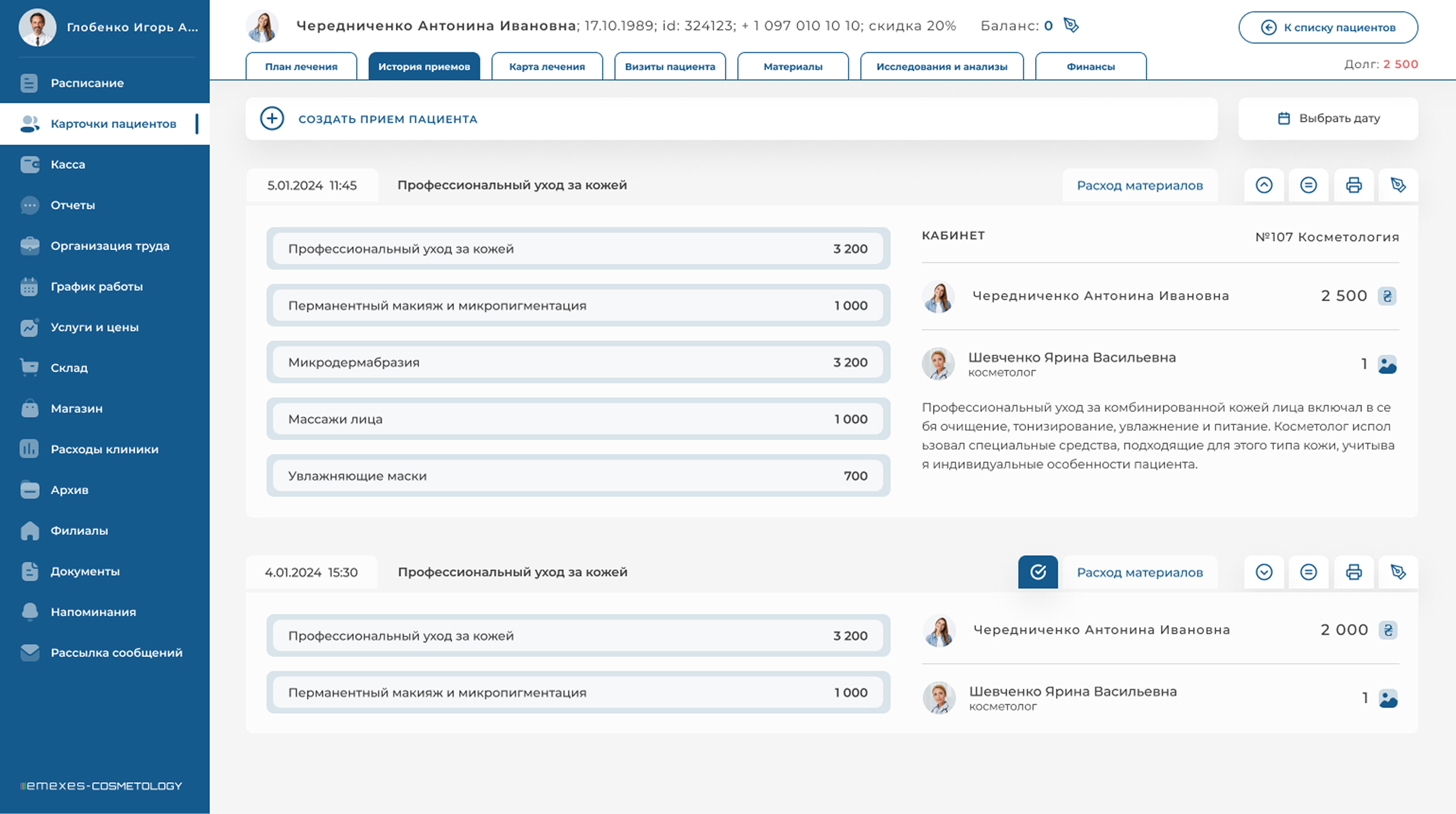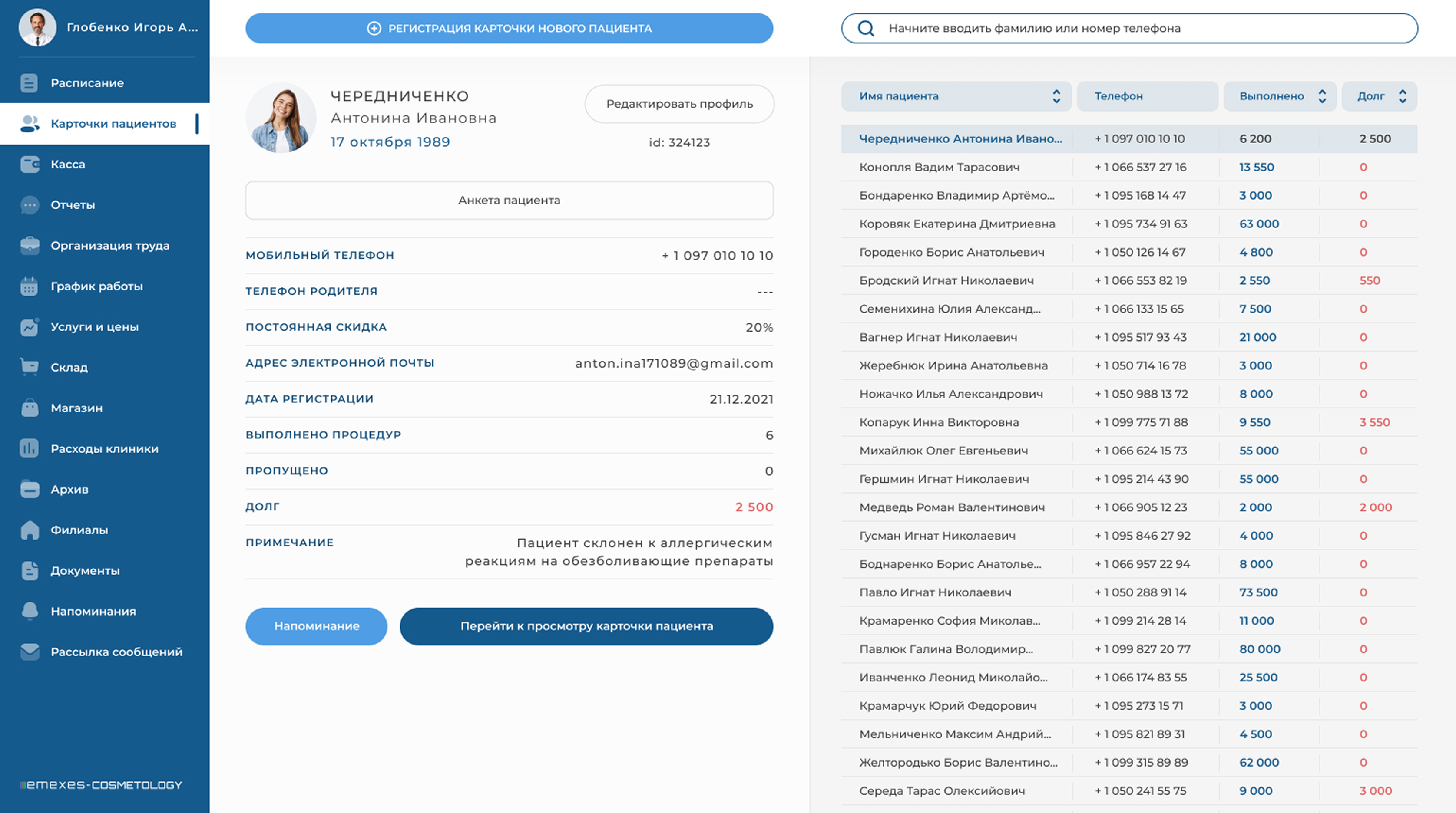 - Автоматизация всех процессов клиники: расписание, карточки пациентов, списание материалов и многое другое