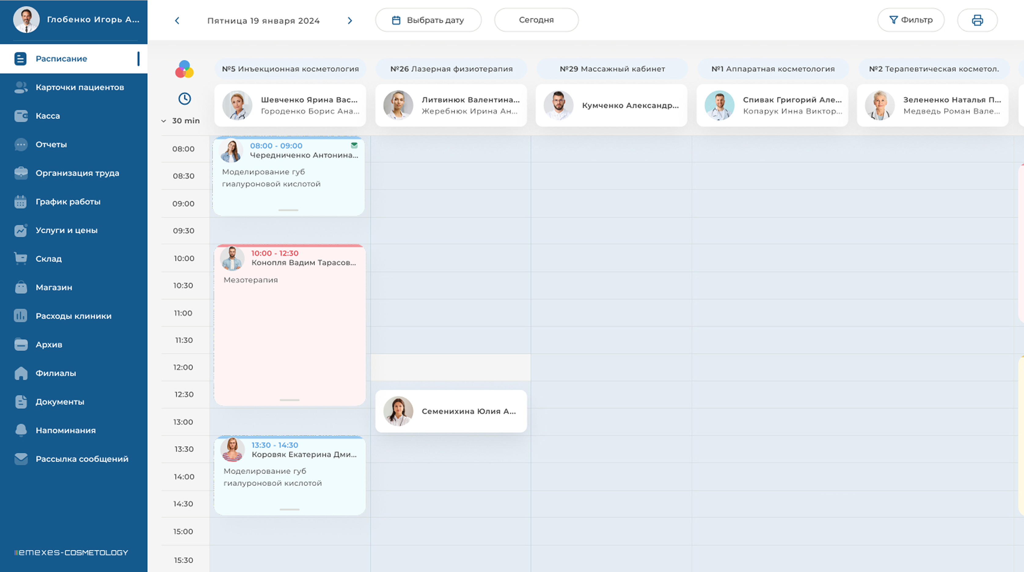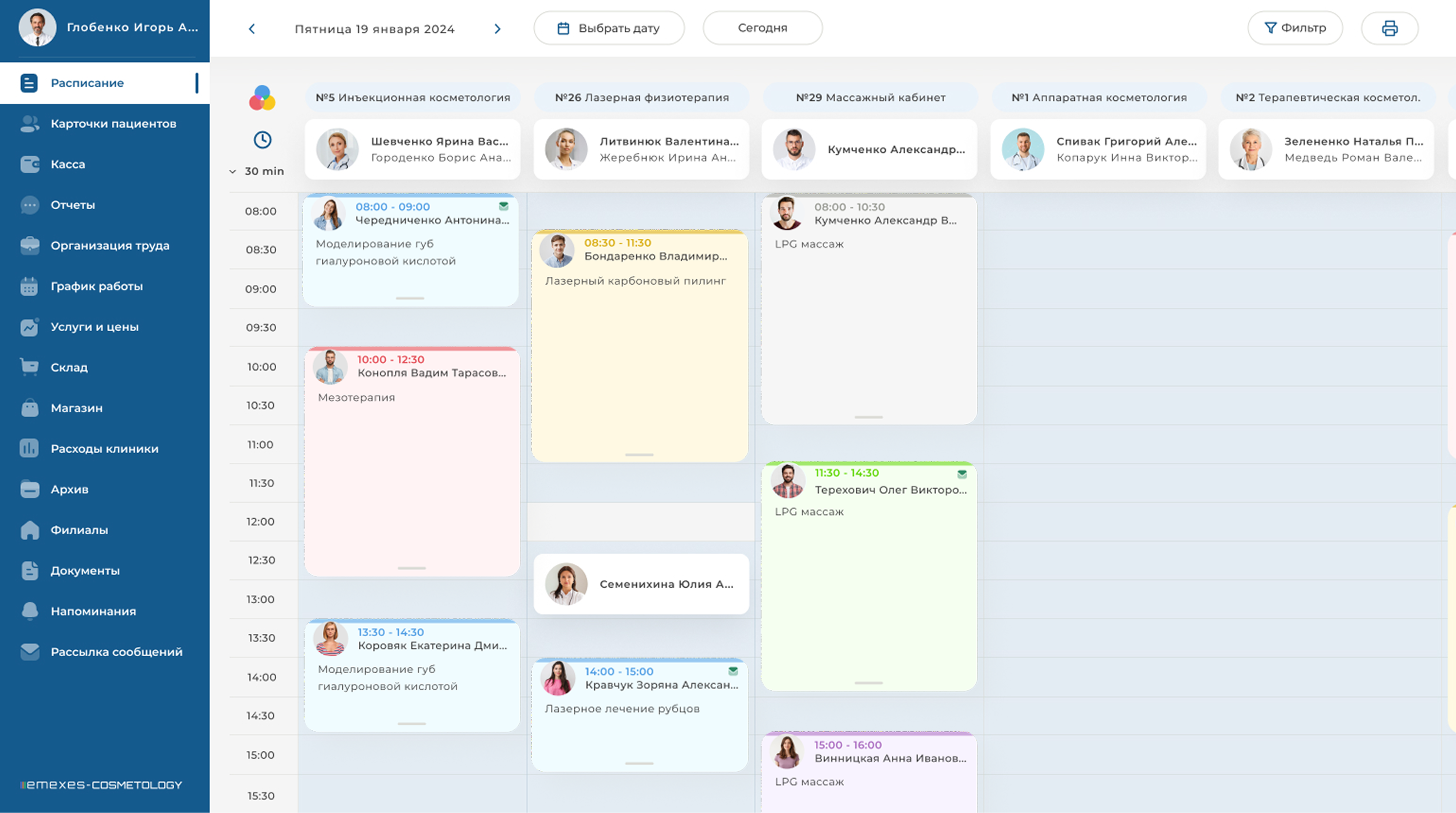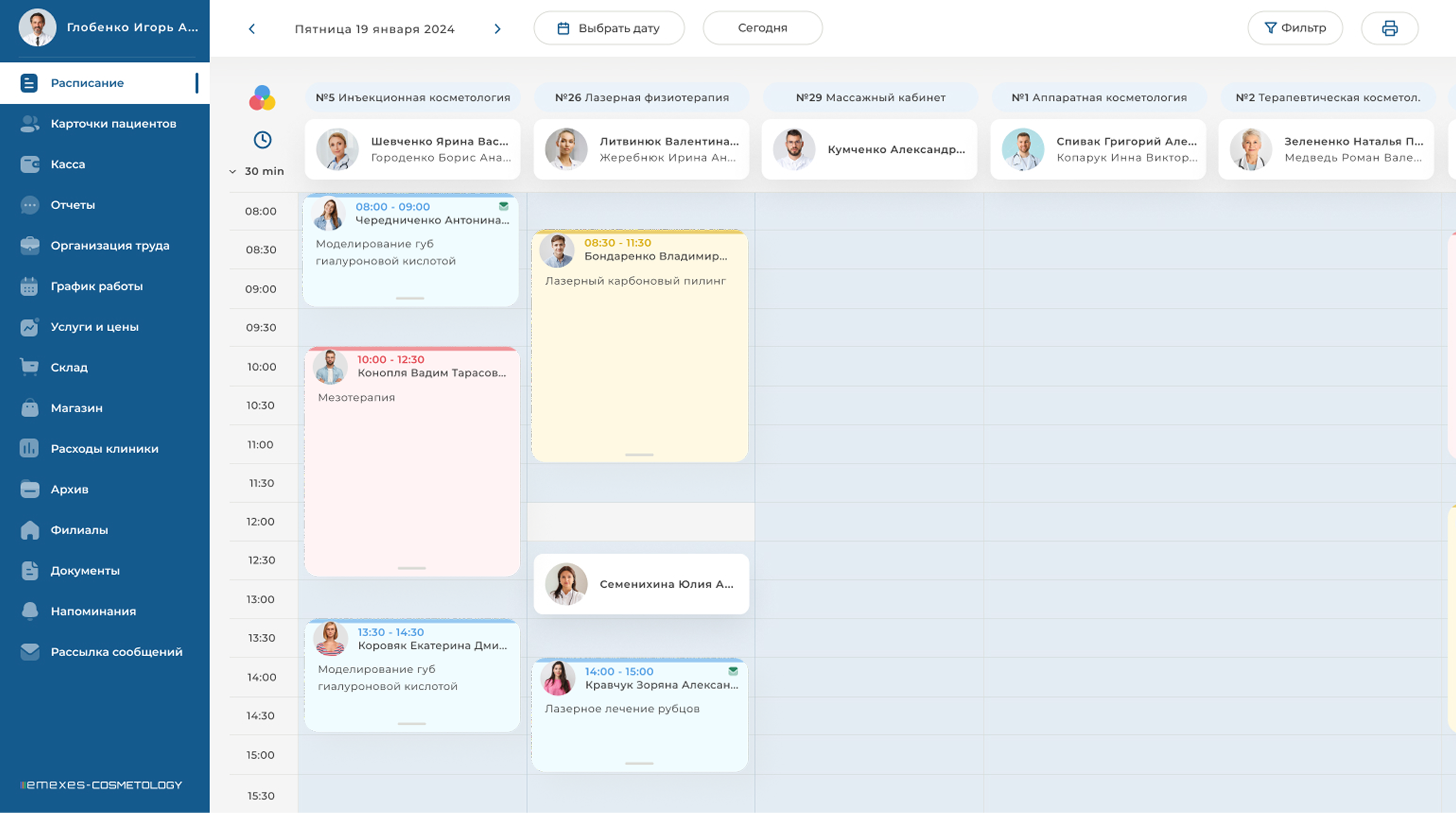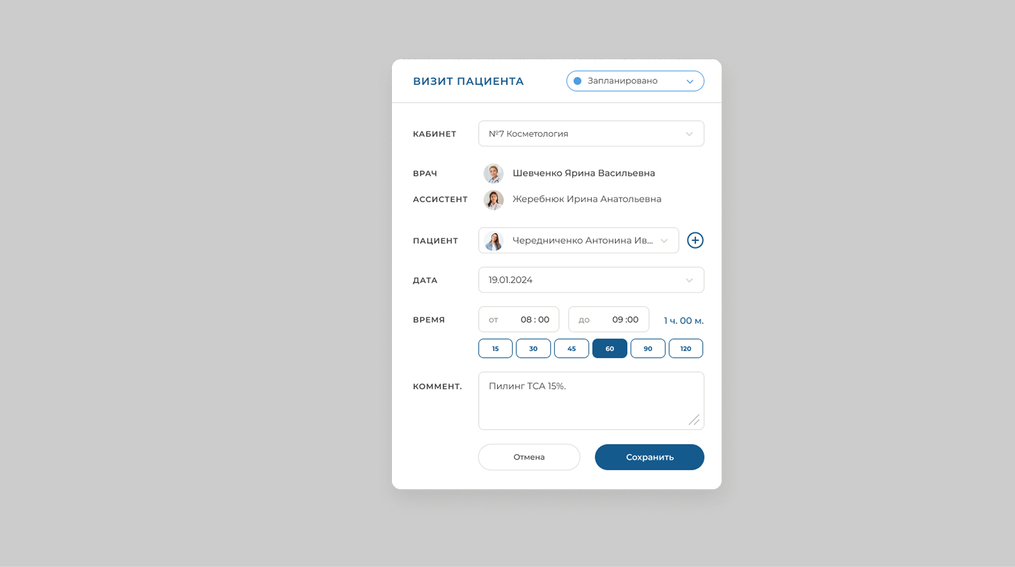 - Автоматизация всех процессов клиники: расписание, карточки пациентов, списание материалов и многое другое