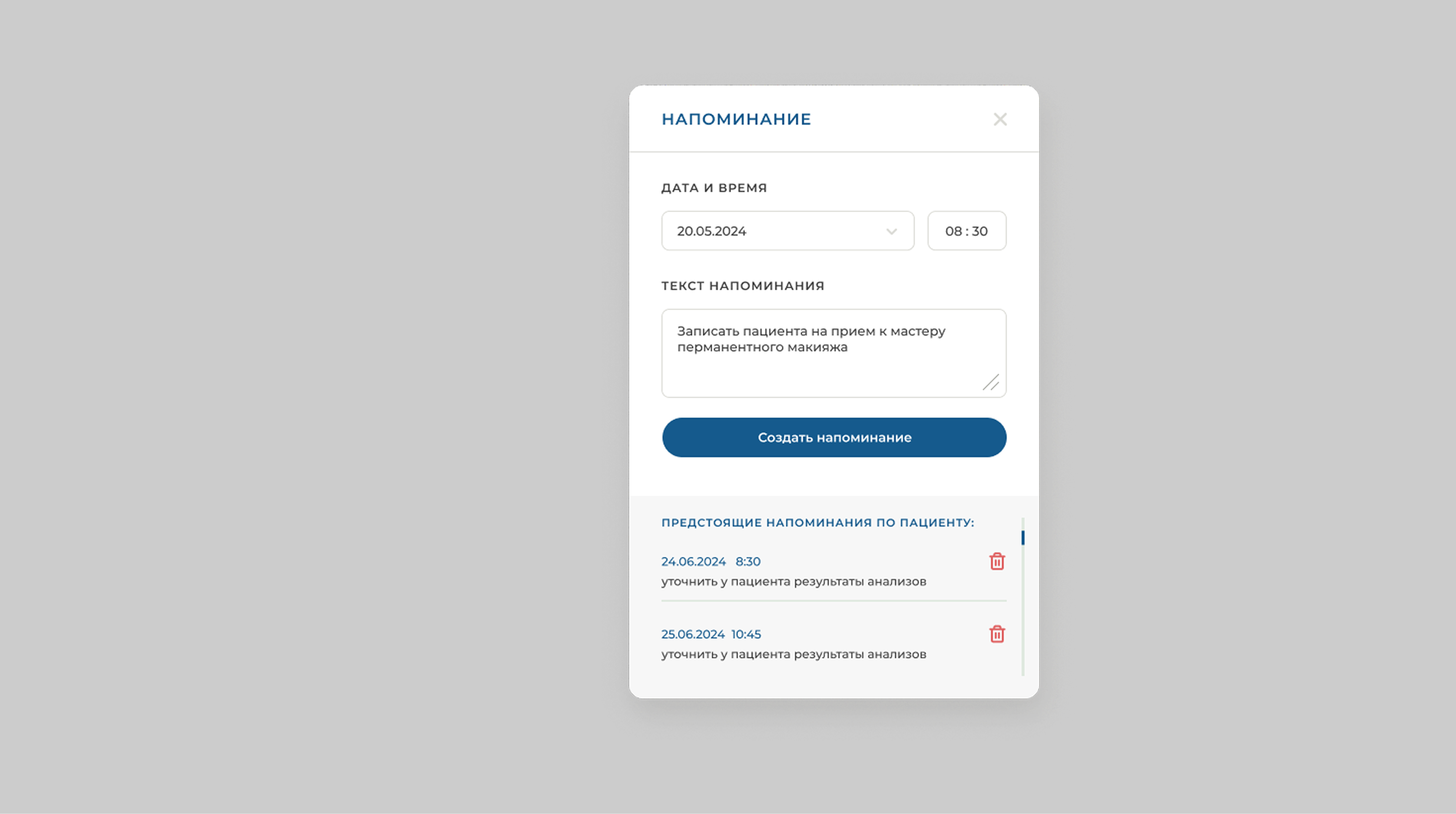 - Удобный функционал для специалистов, администраторов и управляющих клиники
